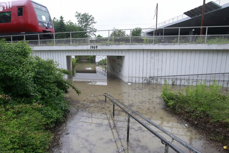 Adgangen til og fra Skovbrynet Station er ikke mulig lige nu: En adgangstunnel står under vand.