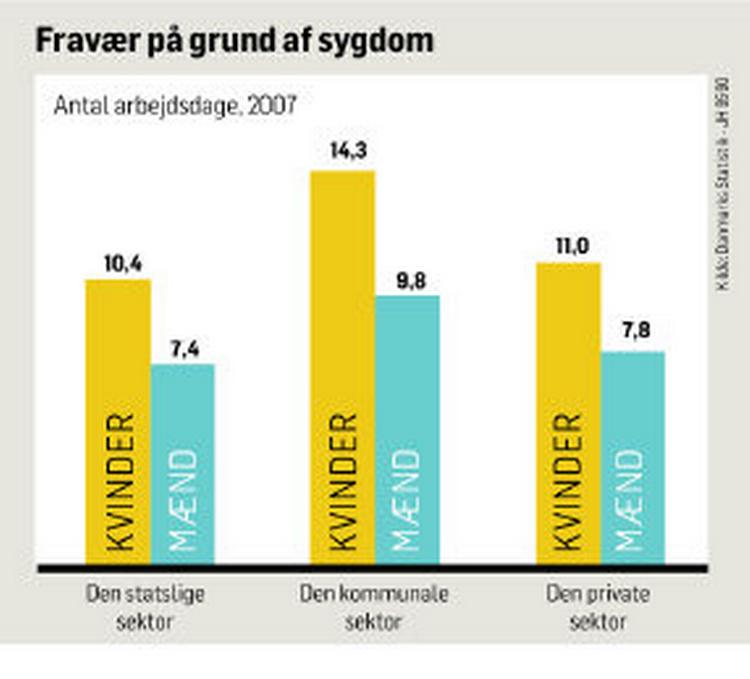 Så mange dage er kvinder i gennemsnit fraværende fra deres job, når de er ansat i et kommunalt job som eksempelvis pædagoger, dagplejere eller social- og sundhedshjælpere. Det viser Beskæftigelsesministeriets analyse ’Kvinder og mænd på arbejdsmarkedet 2009’, der udkommer i dag. Tallene afspejler et yderst kønsopdelt arbejdsmarked.