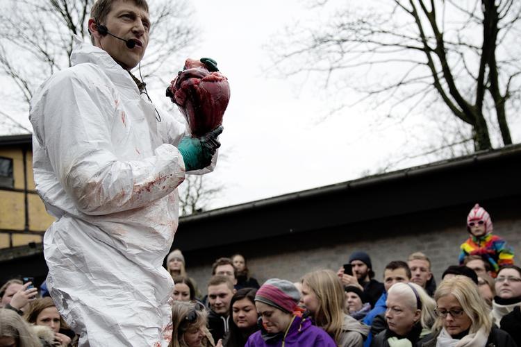 »Marius startede dagen med at gå i folden og få noget rugbrød. Det kan han rigtig godt lide. Da han stod roligt og kiggede op, så tog jeg min riffel og skød ham lige igennem hjernen«. Dyrlæge Mads Bertelsen står i midten af en kødrand af mennesker og fortæller. Tilskuerne er netop gungret igennem ZOO for at få førsteparket til obduceringen af den nu verdenskendte giraf ’Marius’. En obducering, der foregår åbent for alle besøgende i haven, og som et stort antal mennesker har valgt at overvære, selv om klokken kun er ti.