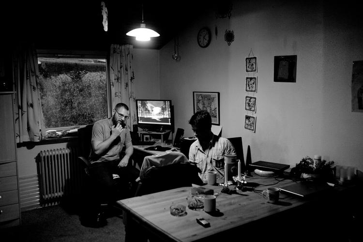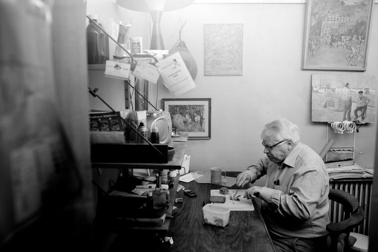 Han sidder lidt krumbøjet og stopper sin pibe. Sindigt piller han den brune tobak op fra den gule metaldåse og ned i piben.