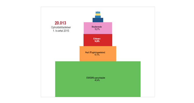 Indtil videre er 20.013 opholdstilladelser blevet uddelt i første kvartal 2015, og mere end 40 procent af alle opholdstilladelser gives til EU/EØS-borgere. Særligt polakker og rumænere er blevet tildelt mange opholdstilladelser. Andelen af flygtninge er på 17 procent, hvoraf syrere udgør den klart største nationalitet.