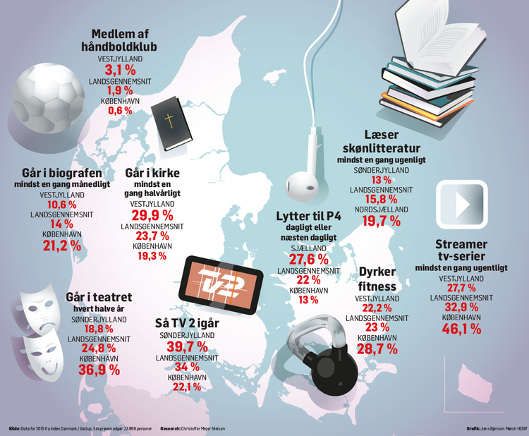 Find ud af, hvor man læser mest skønlitteratur, hører elektronisk musik eller ser mest sport i tv og se, og hvordan din egen landsdel skiller sig ud fra gennemsnittet.