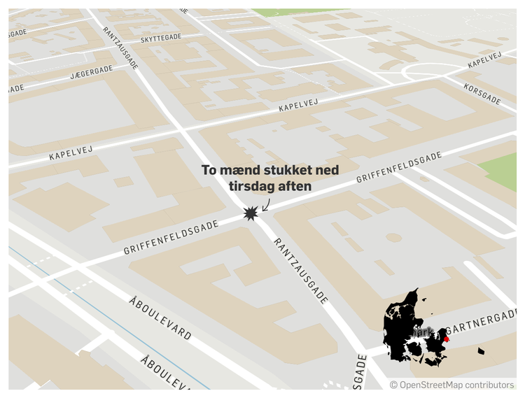En eller flere gerningsmænd er stadig på fri fod, efter at to mænd tirsdag aften blev stukket ned på Indre Nørrebro i København.