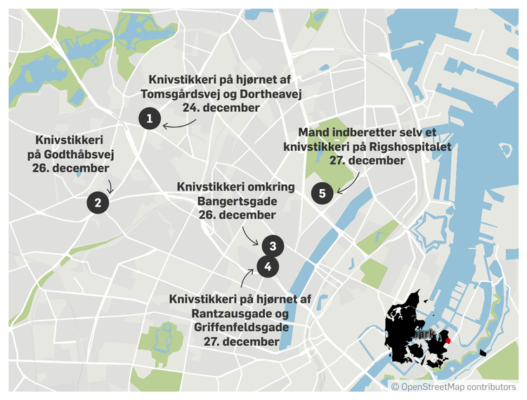 Fem knivstikkerier har fundet sted på fire dage i København og på Frederiksberg siden juleaften.