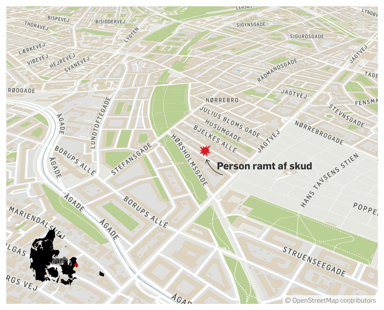 Politiet fik anmeldelsen om et skyderi ved Jægersborggade mandag klokken 20.02 og efterforsker fortsat i området, oplyser Torben Madsen. Tirsdag formiddag oplyser Københavns Politi, at der er en omfattende og bred efterforskning i gang. Hovedfokus for politiet er, om skudepisoden kan være gengældelse for nogle af de knivstikkerier, som der har været i København siden jul. Københavns Politi oplyser ikke yderligere om den forurettedes tilstand tirsdag formiddag.