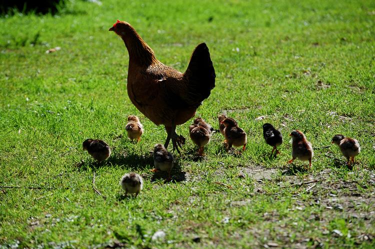 Begge parter er fritgående og accepterer hinanden. Dog har hunden et blødt punkt, når hønsene skræpper op eller løber. Så skal den lige se, om der er et eller andet, den skal være med til. En skræppende høne på flugt er uimodståelig. Den løber efter, hønen løber hurtigere, og hunden synes, at det er evig sjovt. Ingen kommer til skade. For tiden er der kommet et nyt element til. Skrukhøne med små kyllinger. De går også rundt derude og har det skønt, og hunden er ret ligeglad. Den ved, at en skrukhøne med kyllinger skal lades i fred. Kommer man for tæt på, risikerer man et angreb.