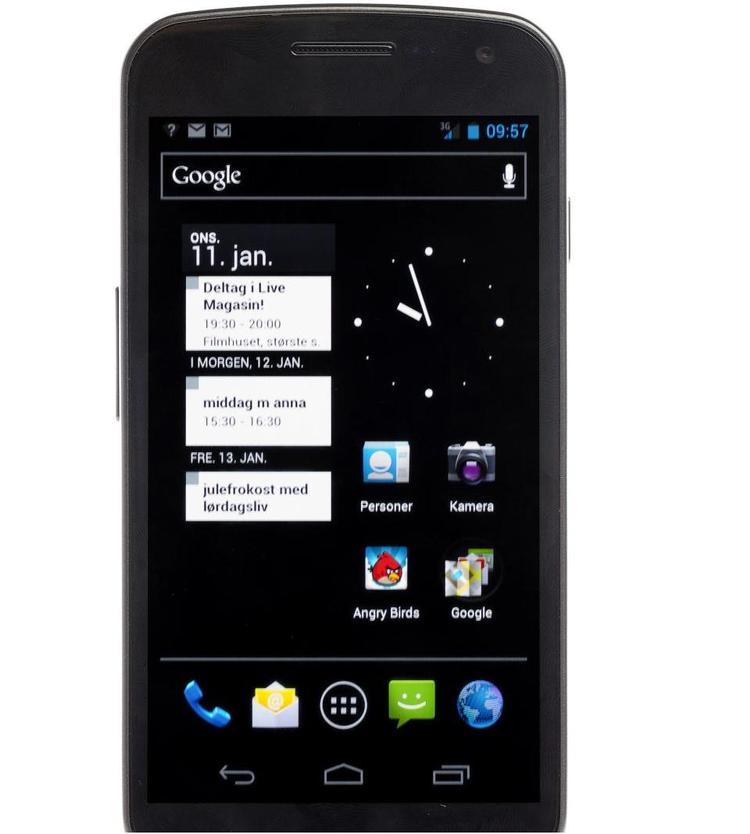 Fysisk design: »Hold kæft, hvor er den enorm«. »Wauv, fed stor skærm!«. Den første reaktion på Samsung Galaxy Nexus handler uundgåeligt om dens store, klare og levende 4,65-tommers skærm. Til sammenligning har en iPhone 3,5 tommer. Der er ingen tvivl om, at det er fantastisk at have så meget grundareal at bygge sit telefonliv på. Film og billeder står smukt, du kan se langt mere af en webside, og du kan uden problemer læse e-bøger. Medaljens bagside er, at telefonen ligger skidt i én hånd. Man må konstant mingelere apparatet rundt i hånden for først at nå toppen af skærmen, derefter bunden, derefter den fjerne side. Det nedsætter betjeningshastigheden og betyder, at man ikke har et konstant fast greb. Den betjenes ofte bedst med to hænder og føles mere som en iPad med telefonfunktionalitet end en egentlig telefon. System: Galaxy Nexus er den første telefon med Android 4, en grundig gennemrenovering og en elegant visuel opdatering af Googles system. Væk er de fysiske tilbage- og menuknapper, som nu erstattes af tre knapper på selve skærmens nederste del. Knapperne krymper til små lysende pletter og giver bedre plads, når man f.eks. ser et filmklip eller billeder. En af de nye knapper giver dig mulighed for at skifte mellem at åbne programmer og lukke dem ned. Det sidste for at modvirke den Android-skavank, at telefonerne bliver langsommere med tiden, fordi brugerne ikke aner, at der kører et dusin programmer i baggrunden. Det oplever man ikke hos konkurrenterne. iPhone-brugere vil hurtitg føle sig hjemme i Android, der har samme grundfunktionalitet, men Android har flere store fordele. Ikke mindst såkaldte widgets, der er store interaktive ikoner, der kan vise dine seneste mail, vejrudsigten, klokken som stort analogt ur og en fantastisk kalender, der på startsiden viser de næste tre-fire aftaler. Android har simpelthen en mere attraktiv og brugbar startside end konkurrenterne. Apps: Androids appstore nærmer sig snart Apples i størrelse, så apps er der masser af, og kvaliteten er sammenlignelig. Googles appstore virker hurtigere, blandt andet fordi den ikke er beskyttet med password. Så hold børnene fra telefonen - du kan dog vælge at angive en kode. Google er langt mere liberal end Apple, med hensyn til hvad brugerne kan få lov til at installere. F.eks. kan du finde mere frækt indhold, værktøjer til at hacke din telefon og såkaldte torrent-programmer til at downloade piratkopierede film - noget, man ikke kan på en iPhone. Du kan se Danmarks Radios programmer på dr.dk, hvad du ikke kan på Apples eller Nokias telefoner. Med telefonen følger Googles solide apps: bl.a. en god kalender, kort med stemmenavigation og Google-maps, der nu også kan vise vej indendørs, f.eks. i visse lufthavne og shoppingcentre. Kamera: Billedkvaliteten er fin, men ikke verdens bedste, til gengæld er kameraet hurtigere til at tage billeder end selv en iPhone. Som en nyskabelse kan du vælge at låse din telefon op med ansigtsgenkendelse: I stedet for at taste en kode kigger du ind i telefonens frontkamera, der prompte genkender dit ansigt og låser telefonen op. Altså så længe belysningen ikke er dunkel, du ikke er i modlys, har hue på, hat, solbriller eller skærer ansigt. Pris: 4.400 kr.