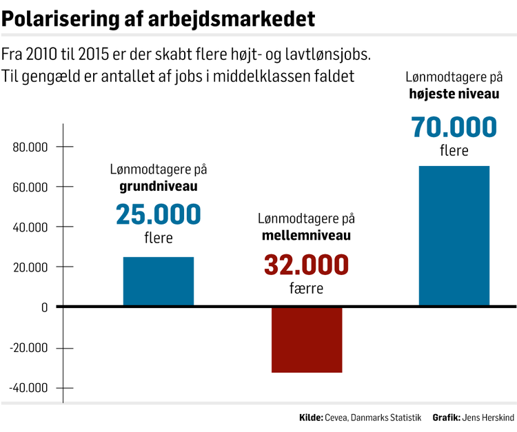 Middelklassejobs er under pres i Danmark. I perioden 2010 til 2015 er der forsvundet 32.000 stillinger, som befinder sig midt på lønskalaen, mens 25.000 stillinger er blevet oprettet på laveste niveau og hele 70.000 i toppen af lønskalaen.