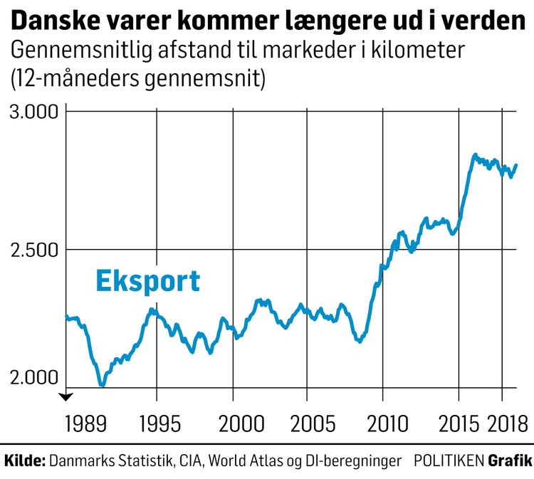 I dag sendes danske varer i gennemsnit cirka 2.800 kilometer ud i verden. Det er omkring 500 kilometer længere end i årene op til finanskrisen i 2007-08, viser en analyse fra DI.