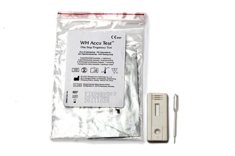 Denne test er indkapslet i en lille kassette, og urinen påføres med en medfølgende pipette.