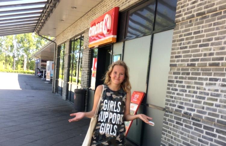 16-årige Anna-Sophie Høegh-Guldberg småløber ud af Circle K i Lyngby, mens hun entusiastisk glædes over, at hun igen er blevet afvist.