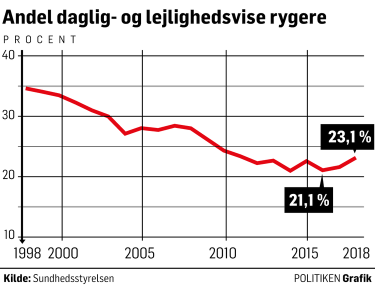 1. Flere danskere ryger. Ser man nærmere på kurven over andelen af rygere de seneste 20 år, minder den lidt om en flyvemaskine, der lægger an til landing, men fortryder i sidste øjeblik og peger snuden mod himlen igen. Andelen af rygere faldt støt fra 1998 og frem, siden fulgte 5 år, hvor kurven blev vandret, hvorefter den fra 2016 til 2018 er gået op igen. For første gang i to årtier er andelen af rygere altså steget. Fra 21,1 procent i 2016 til 23,1 procent i 2018.