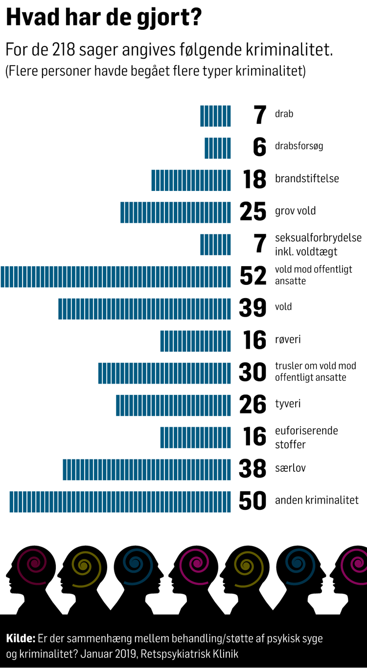 Disse er blot to sager i et omfattende materiale, der er analyseret i en ny og endnu ikke offentliggjort rapport, som Politiken har fået aktindsigt i. Den er udarbejdet af Retspsykiatrisk Klinik under Justitsministeriet og undersøger sammenhængen mellem psykiatrisk behandling og kriminalitet som drab, drabsforsøg, grov vold, vold, trusler om vold, voldtægt og ikke personfarlig kriminalitet.