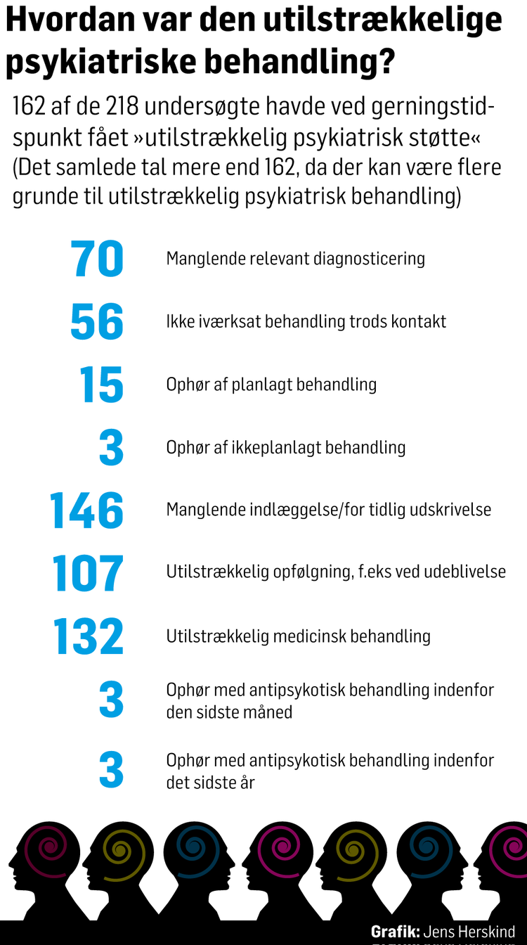 Konklusionen fra den nye rapport lyder, at i 74 procent af sagerne fik personen »utilstrækkelig psykiatrisk behandling« i tiden op til, at vedkommende begik kriminalitet, ligesom det vurderes, at den utilstrækkelige behandling »er en risikofaktor for kriminaliteten«. Rapporten omhandler syv drab og seks drabsforsøg. Her er vurderingen, at i 11 ud af 13 sager var behandlingen utilstrækkelig, inden personen begik forbrydelsen.