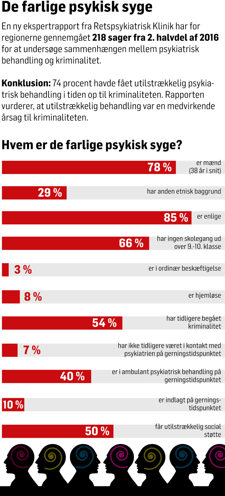 Mentalerklæringerne fra andet halvår af 2016 om de syv drab skal ses i lyset af, at der i hele 2016 blev begået 50 drab i Danmark. Set ud fra disse tal bliver en stor andel drab i Danmark begået af en person med psykisk sygdom.