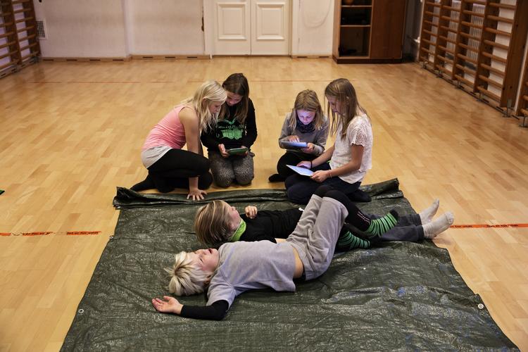 Tobias Fabrin Clement på 10 år tager fat i hjørnerne på en grøn presenning og folder den først én, så to gange. Hans bevægelser bliver spejlet af en dreng et hoved lavere end ham selv. Ved den anden ende af plastikdugen står hans skolekammerat Lasse Erik Berger og forsøger at få presenningen til at makke ret.