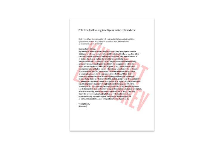 Kære læser, over disse ord ser du det første læserbrev, en chatbot har fået optaget på Politikens debatsider. Det bliver ikke det sidste. For 30. november fik alle, der arbejder med sprog, en eksistentiel udfordring. Udfordringen hedder ChatGPT: En virtuel sprogmaskine, der ved hjælp af kunstig intelligens og data, som den har støvsuget internettet for, kan løse alle sproglige opgaver på få sekunder. Og vel at mærke, så den lyder som et menneske.