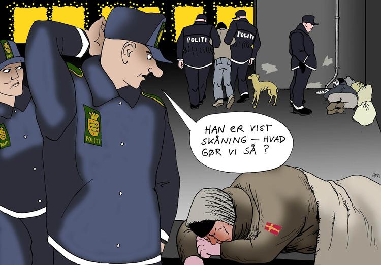 Eftersom den danske lovgivning ikke må diskriminere, håber justitsministeren, at ’vore gode folk’ er i stand til at håndtere zoneforbuddet for hjemløse i den ånd, det er tænkt. Tegning: Anne-Marie Steen Petersen