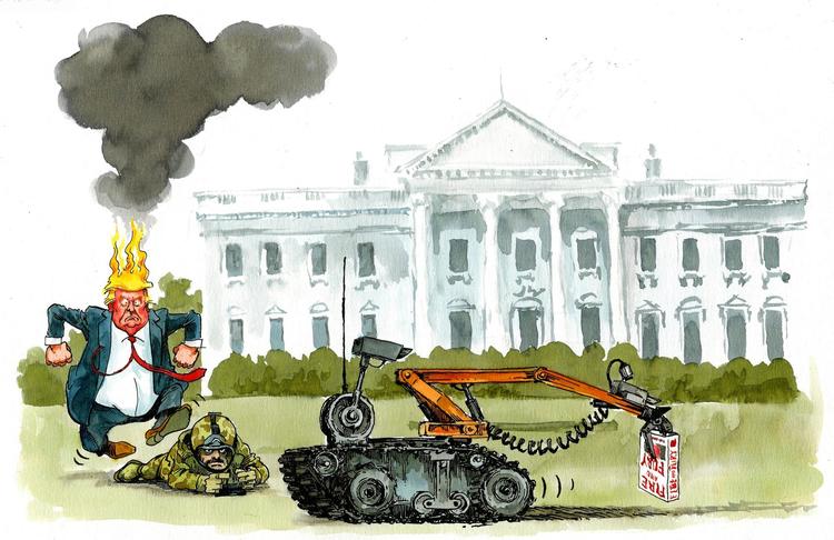 Der er udkommet en bog om præsident Trumps første år som præsident. Tegning: Roald Als