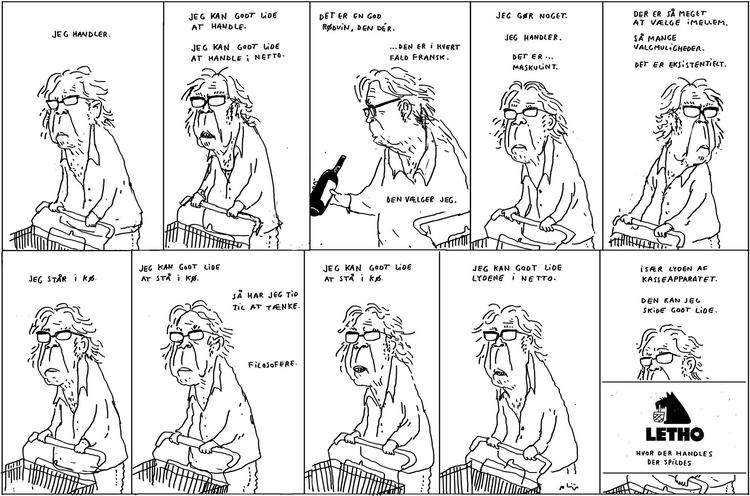 Æstetikeren og levemanden Jørgen Leth lovpriser Citroën i ny reklamekampagne. Tegning: Philip Ytournel