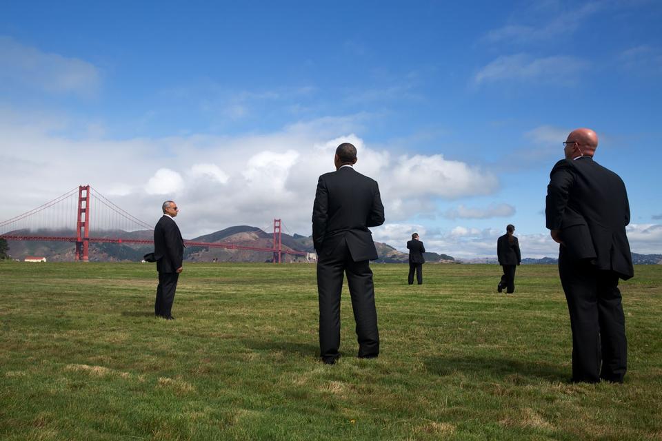 Og her er det Secret Service-agenter i en næsten Magritte-agtig opstilling, der står spredt rundt om ham en dag i 2014 i San Francisco, inden han går om bord i helikopteren Marine One.