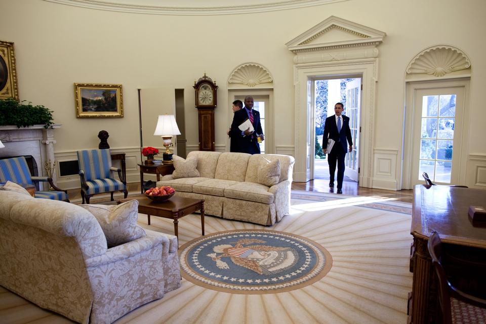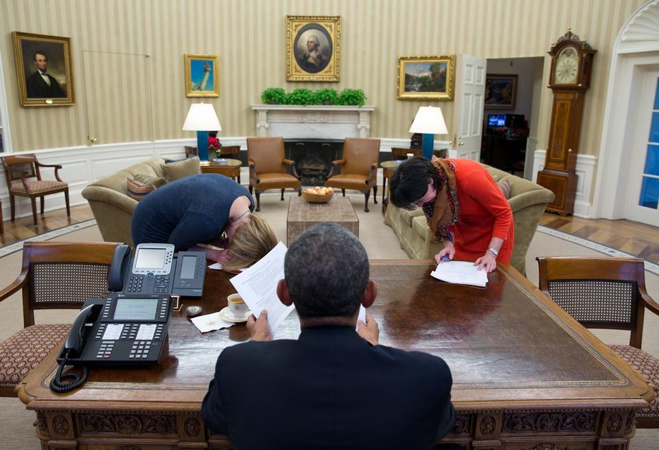 Da Pete Souza blev tilbudt jobbet, satte han som krav - har han fortalt - at han ville have adgang til alt, som præsidenten foretog sig i embeds medfør. Uden diskussion. Hver morgen er han derfor typisk mødt op i The Oval Office - som her på præsidentens allerførste arbejdsdag i januar 2009 - og har hængt dér hele dagen, bortset fra 20 minutters frokostpause.