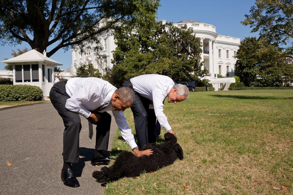 Og så den anden vej. Denne gang med den hund, som præsidentfamilien samme dag besluttede sig for at indlemme i familien. Fotografiet blev »hemmeligholdt«, som Pete Souza kalder det, i nogle uger i 2009, fordi hunden først kunne flytte ind efter en udlandsrejse. Herefter blev den portugisiske vandhund Bo introduceret for verden.