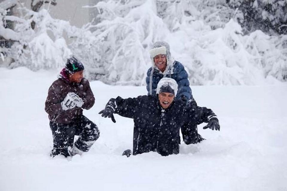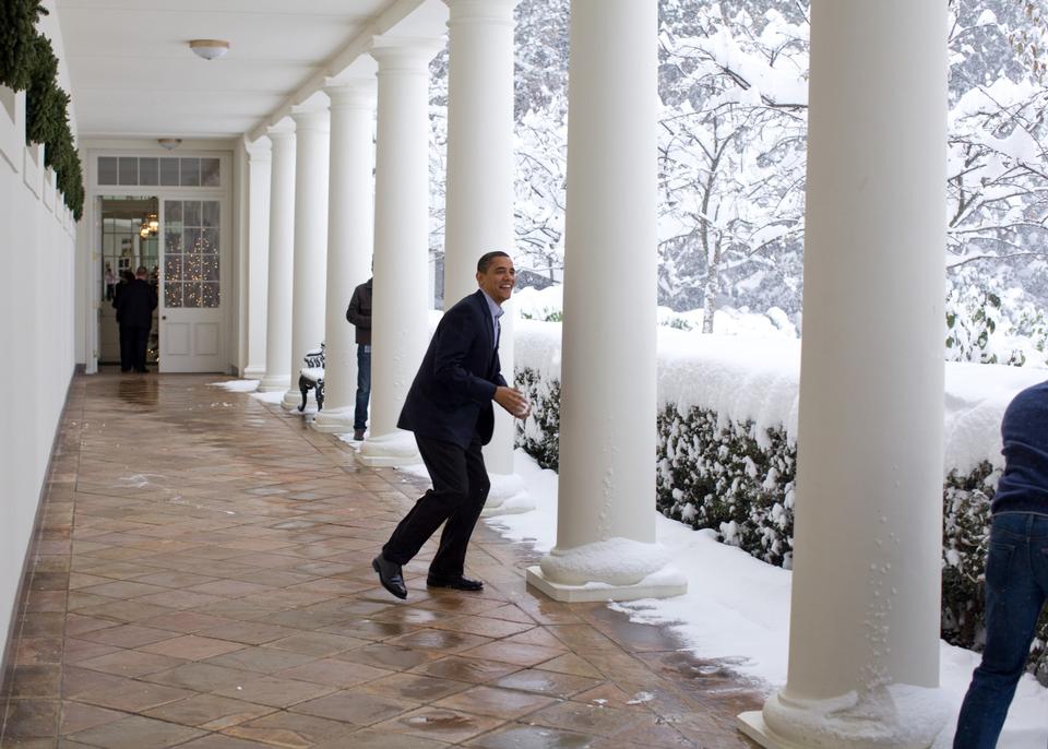 Men der er jo dét med sne, at man kan kaste med det. Efter sine ansatte. I billedteksten har fotografen Pete Souza skrevet, at personalechefen (th.) måtte flygte ud i rosenhaven, »hvor sneen desværre for ham lå i knæhøjde«.