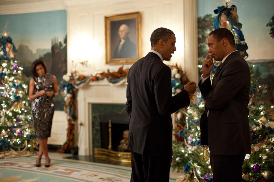 Fire år efter stod Souza også kun et skridt bagved, da Obama arbejdede på tiltrædelsestalen sammen med sin personlige taleskriver, Jon Favreau, 16. januar 2013.