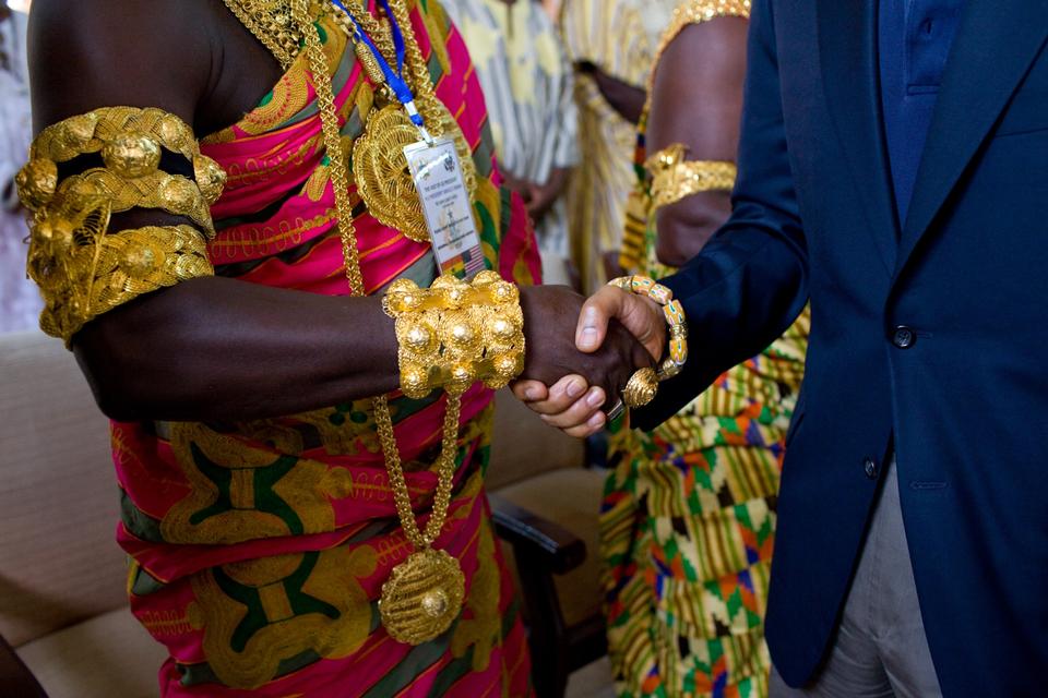 I nogle tilfælde trykkes der hænder med nogle, der bærer mere gyldne og tungere statussymboler end selv den mest magtfulde af de vestlige verdens ledere. Her et stammeoverhoved fra Ghana i Vestafrika i 2009.