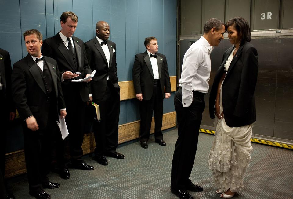 Hvad angår fotos af præsidentparret i mere private situationer - hvoraf dette fra en kølig vareelevator på vej til et tiltrædelsesbal 20. januar 2009 var et af de første, der gik viralt - har fotografen Pete Souza haft den aftale, at præsidenten kunne bede ham om ikke at fotografere.