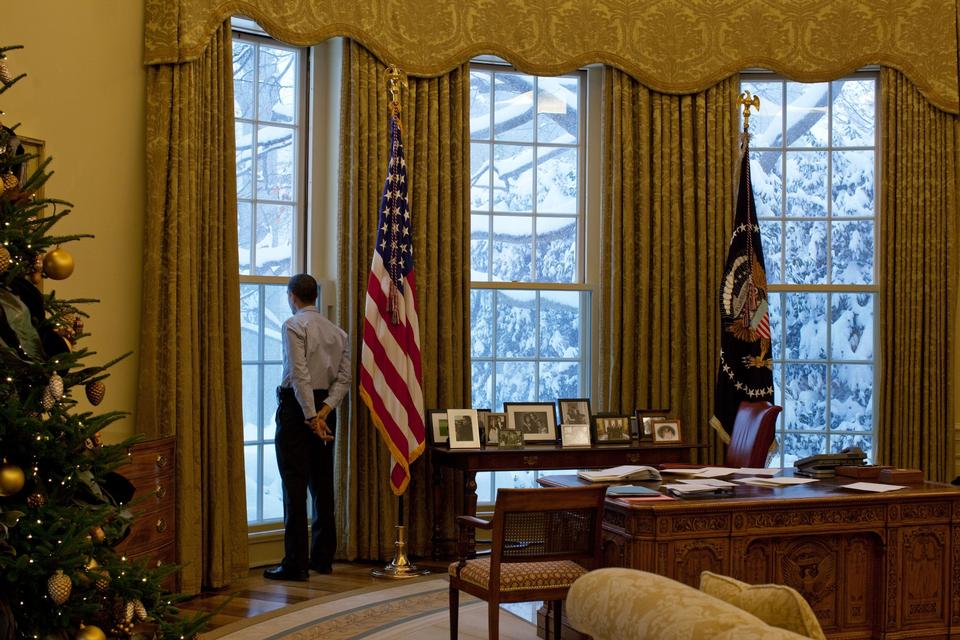 På en af sine første officielle opgaver som Det Hvide Hus' chef-fotograf tog Pete Souza, der tidligere har været ansat på The Chicago Tribune, dette foto af 'the president-elect', der kaster det sidste blik i spejlet, inden han går ud på U.S Capitols vestlige trappe og aflægger ed 20. januar 2009. Og bliver USA's præsident.