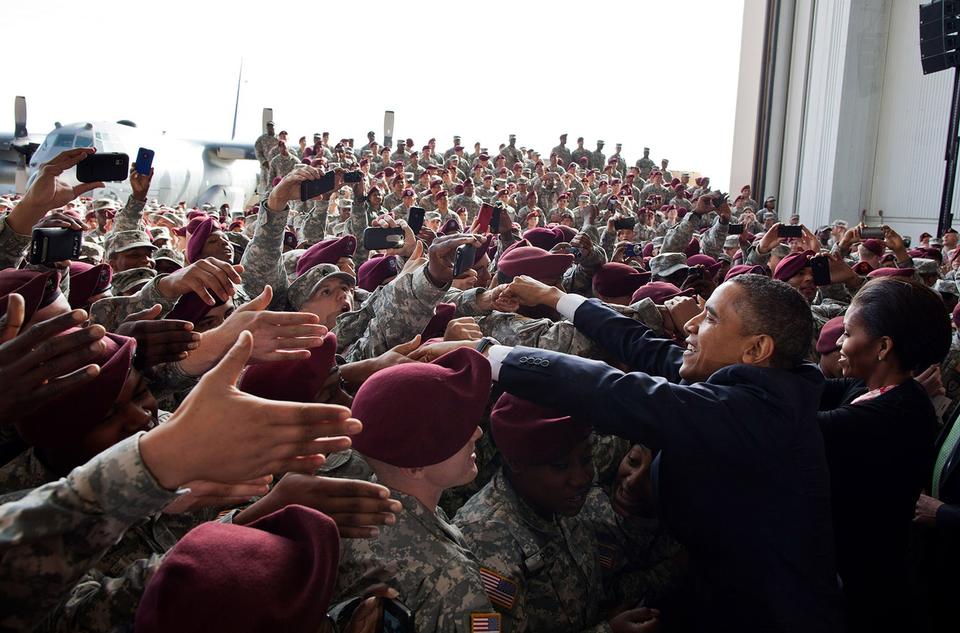 Der kan også være for mange hænder. Som da præsidentparret mødte tilbagevendte amerikanske soldater fra Irak under et besøg på militærbasen Fort Bragg i North Carolina.
