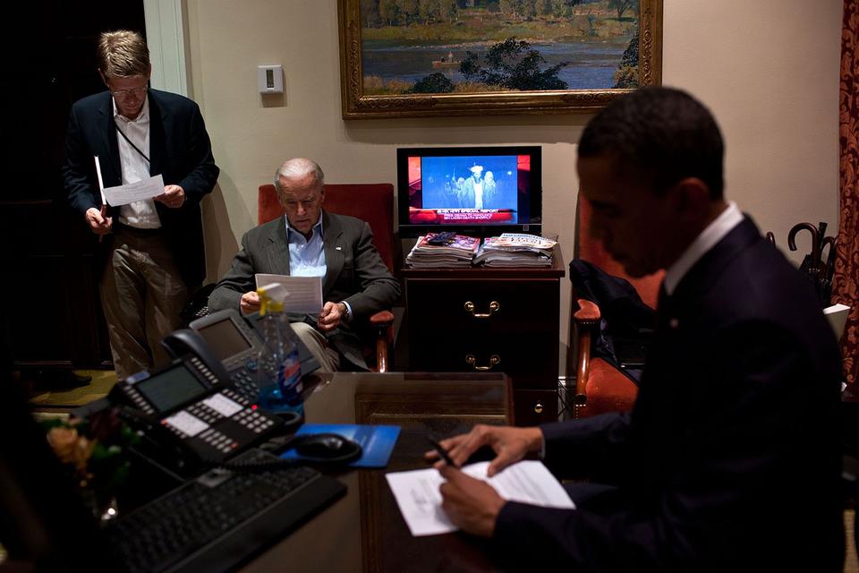Lidt mindre kendt er måske Pete Souzas foto af Barack Obama, der samme aften sidder og finpudser manuskriptet til den tale, han skal holde på tv om Osama bin Ladens død - mens et billede af terrorlederen toner frem på skærmen ved siden af vicepræsident Joe Biden.
