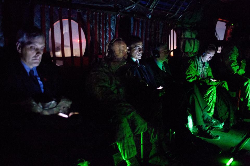 Og indenfor i maskinens mørke efter takeoff i Kabul, hvor Obama i 2012 besøgte Afghanistans præsident Hamid Karzai.