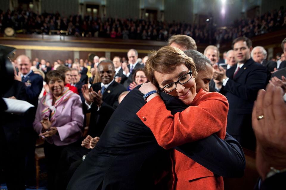 I et interview har Pete Souza sagt, at han aldrig har følt sig helt tilpas ved at tage billeder af præsidenten sammen med pårørende til ofre for eksempel skole-attentater eller terrorangreb. Her falder omfavnelsen dog i glæde - over at se politikeren Gabrielle Giffords et år efter, at hun blev ramt i hovedet af skud i Tucson, Arizona i 2011.