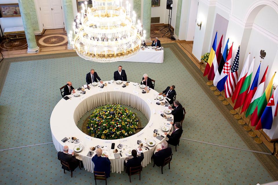 Anderledes formelle forhold blev der spist under, da Obama mødtes med ledere af de central- og østeuropæiske lande i Warszawa i 2014. Trods god plads var det åbenbart ikke alle, der fik plads ved hovedbordet.