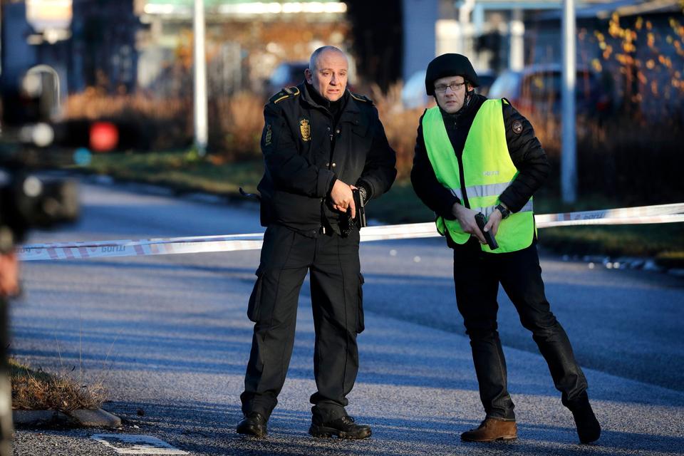 Albertslund, 6. december 2016. To politibetjente har trukket deres tjenestevåben, efter en af deres kolleger er blevet skudt ned foran politigården i Albertslund. Den 43-årige betjent døde siden af sine kvæstelser. Foto: Jens Dresling/Politiken