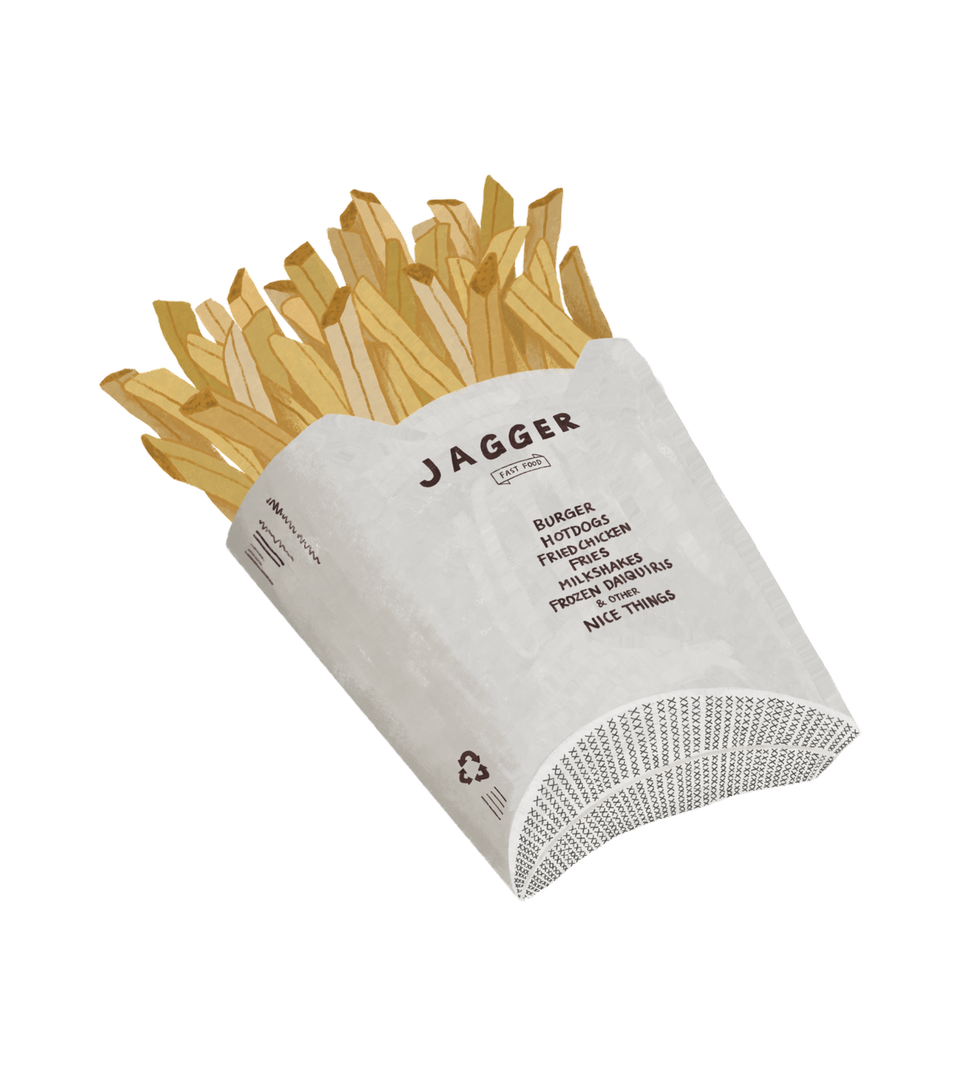 De knaser, så det kan høres i kraniet. Jaggers gyldne sveller klarer den afgørende kvalitetsparameter – sprødhed – med flyvende faner. At de er lavet på rigtige kartofler, ikke pulver, beviser striber af skræl på de tynde trommestikker i dukkeformat. Og så er de pudret med fint salt, så man sidder med en smag af franske kartoffelchips i munden.