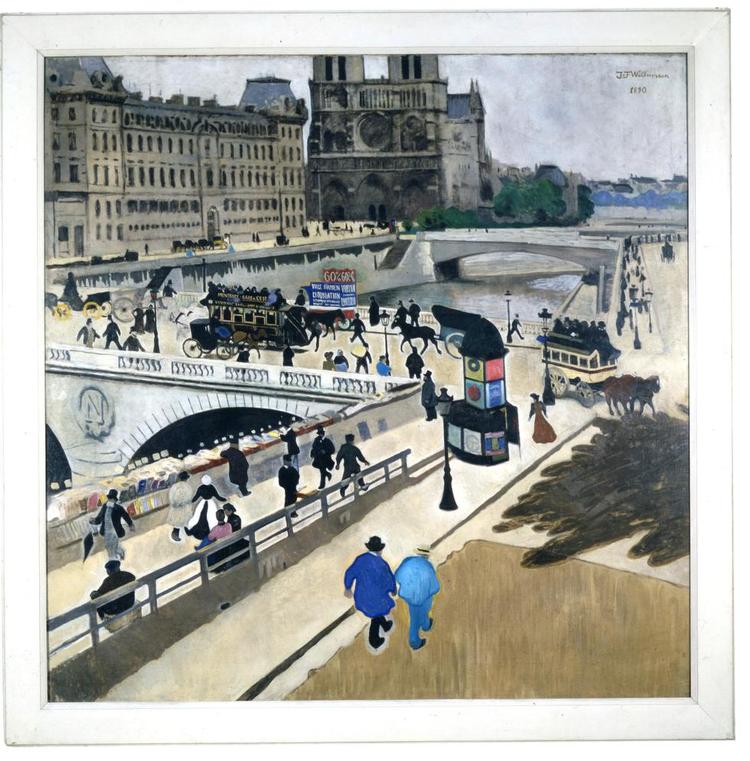 Lige så få mennesker, der var på gaden i Hammershøis maleri fra London, lige så meget mylder er der i ’Billede af livet på Paris’ kajer’ fra 1890 af J.F. Willumsen.