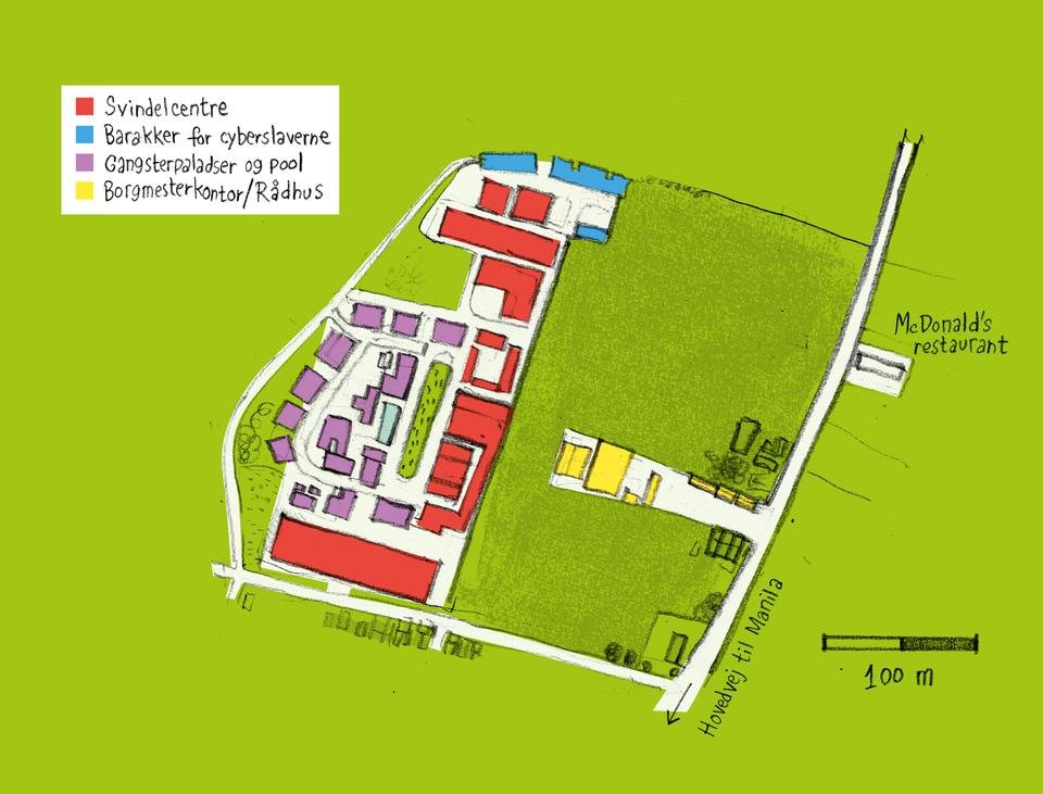 Bamban er en soveby med godt 7.000 indbyggere, og centret troner som en fabrik over de lave byhuse i baggrunden. Når man ser det, er det umiddelbart utroligt, at ingen fattede uråd tidligere. Da svindelcentret blev bygget, gav det arbejde til det halve af byen, og gangsterbosserne kastede om sig med penge. Langs hovedvejen åbnede både en McDonald’s og en Jollibee, en filippinsk fastfoodkæde.