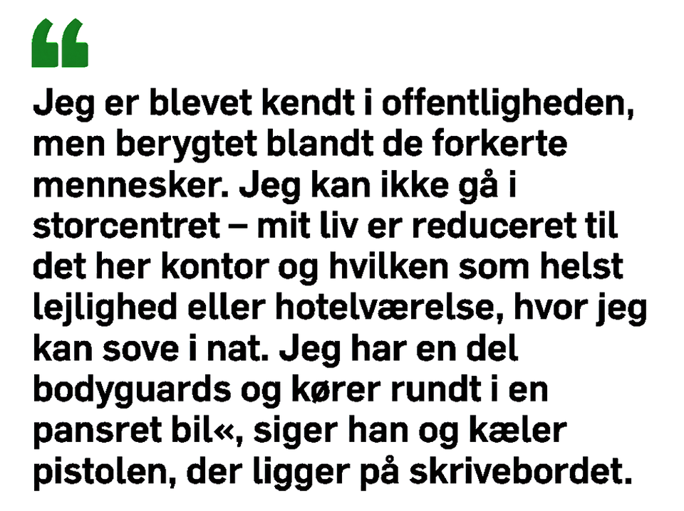 »Men hvis jeg blev spurgt, ville jeg gøre det igen. Jeg har set ofrene for menneskehandlen. Torturofrene. Jeg har set det hele. Vi har kun ét liv, og vi er nødt til at gøre det rigtige. Det skal ikke lyde som om, jeg er en helgen, for det er jeg ikke. Jeg har en beskidt mund og et dårligt temperament. I har set medierne. Jeg stak nogen en flad. Så nu tager jeg medicin for at styre mit temperament, og whiskyen drikker jeg kun om fredagen. Jeg bliver bare så rasende over dumheden. Over korruptionen. Jeg hader, hvad mange af mine kollegaer har gang i«.