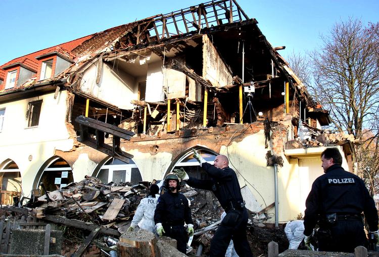 De flygtede med udbyttet, mere end 10.000 euro, på cykler, som de udskiftede med en autocamper med nummerplader fra Sachsen. Omkring kl. 12 fandt politiet bilen parkeret på en villavej i Strega, nogle få kilometer nord for Eisenach. Inden betjentene kunne trænge ind i autocamperen, stak en flamme ud af køretøjet, og der lød to skud. I den udbrændte bil fandt politiet to mænd, den 38-årige Uwe M. og den 34-årige Uwe B. »Mændene har definitivt skudt sig selv«, sagde en talsmand for politiet i Thüringen. Dramaet har ført til opklaringen af nogle af de alvorligste forbrydelser i Tyskland inden for de seneste ti år. Det drejer sig om mindst ni seriemord på mennesker med indvandrerbaggrund fra 2000 til 2008 samt et opsigtvækkende mord på en kvindelig politibetjent i 2007. Højreekstremistisk gruppering Statsadvokaten i Karlsruhe har overtaget sagen, fordi den har national betydning og et muligt politisk motiv. »Der foreligger tilstrækkelige holdepunkter for, at mordene kan tilskrives en højreekstremistisk gruppering«, sagde statsadvokaten i går. Indicierne er uafviselige. For kort tid efter den dramatiske episode i Strega skiftede scenen til Zwickau, en by i den østlige nabodelstat Sachsen. En 36-årig kvinde, Beate Z., løb i stor hast ud af det hus, hvor hun havde lejet en lejlighed. Hun nåede i farten at aflevere sin kat til naboen med besked om, at hun skulle tage sig godt af den. Derefter sprang lejligheden i luften og udbrændte. I de sodsværtede ruindynger fandt politiet 11 skydevåben, herunder et automatgevær og en maskinpistol. Et af disse våben er en såkaldt Ceska 83, kaliber 7,65 mm. Med denne pistol har ukendte gerningsmænd begået de såkaldte Döner-mord på otte indvandrere med tyrkisk baggrund og en med græsk. Ofrene blev alle overrasket i deres forretninger og skudt ned. Der var ingen vidner. Politiet har aldrig kunnet finde et motiv til denne stribe etnisk betonede mord, og der var ingen forbindelse mellem ofrene. Mordene fandt sted overalt i Tyskland. Blandt de andre våben i lejligheden var et særligt våben, der stammede fra Balkan. Pistoltypen var identisk med det våben, den 22-årige politibetjent Michele Kiesewetter blev dræbt af 25. april i 2007. Tjenestepistoler og håndjern Sammen med ligene af de to mænd i autocamperen fandt politiet to tjenestepistoler, håndjern, en ganske særlig hobbykniv og en peberspray, der havde tilhørt Kiesewetter og hendes ledsager, en yngre mand. De to betjente blev skudt i hovedet bagfra på en parkeringsplads i Heilbronn i delstaten Baden-Wüttemberg. Kiesewetter var dræbt på stedet, mens hendes mandlige kollega overlevede. Han lå i længere tid i koma og kunne siden intet huske. Det er stadig en gåde, hvorfor de to politifolk blev overfaldet. Beate Z. boede i Zwickau-lejligheden sammen med de to mænd, hvis lig blev fundet i autocamperen. Desuden boede der yderligere en kvinde, som nu omtales som politiets vidne. Der blev omgående udsendt en international arrestordre på Beate Z. Hun meldte sig frivilligt til politiet i tirsdags i selskab med sin advokat. Hun og de to mænd har været eftersøgt siden 1997. Der kan være tale om politiske forbrydelser. De tre personer havde tætte kontakter til det nynazistiske miljø, der er særdeles udbredt i de østtyske delstater. I Sachsen har nynazisterne været repræsenteret i landdagen siden 2004. Beate Z, Uwe M. og Uwe B. lagde i 1997 en bombe skjult i en kuffert med et påmalet hagekors i et teater i Jena i Thüringen. Katastrofen blev undgået, fordi tændsatsen ikke virkede. De tre blev eftersøgt, og det kom frem, at de hørte til en højreekstremistisk forening, Thürings Hjemmeværn. Men det lykkedes aldrig politiet at finde gerningsmændene. Og det på trods af at efterretningstjenesten i Thüringen havde infiltreret gruppen, hvis formand var politiets meddeler. »Det er ikke uden betydning, hvilket miljø gruppen af gerningsmænd tilhører«, sagde en talsmand for politiet i Heilbronn i Baden-Württemberg forleden. Det er i denne delstat, at mordet på den 22-årige politibetjent fandt sted.