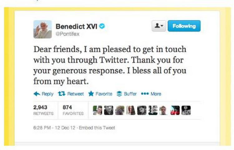 'Kære venner, jeg er glad for at være i kontakt med jer på Twitter. Tak for jeres generøse respons. Jeg velsigner jer alle fra mit hjerte', skriver paven i sin første melding.
