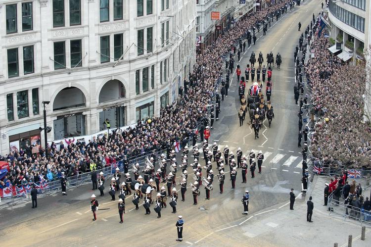 Endvidere røg der en del penge på ekstra sikkerhed i forbindelse i forbindelse med, at kisten blev transporteret i en procession gennem Londons gader fra Westminsterpaladset, hvor det britiske parlament bor, til kirken St Clement Danes. Herfra blev kisten transporteret videre af en militæreskorte til St. Pauls Cathedral.