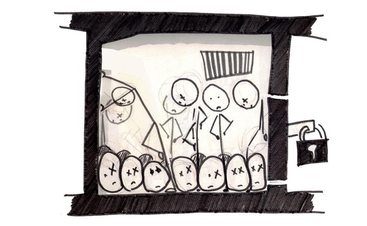 <p> <i>’Ali’ er et opdigtet navn af hensyn til torturfangen og hans nærmestes sikkerhed. Hans rigtige navn og identitet er kendt af redaktionen.</i> </p> <p> Ti meter under en af Damaskus’ boulevarder sidder flere hundrede fanger i et torturfængsel drevet af den syriske sikkerhedstjeneste. Mens militæret angriber oprørere og civile med artilleri og luftangreb, piner sikkerhedstjenesten informationer ud af mænd, kvinder og børn i mere end 26 lignende fængsler. </p> <p> Over hele landet er anslået mindst 25.000 tilbageholdt, siden revolutionen begyndte i marts 2011, og indtil for nylig var en af dem Ali. </p> <p> Han er en ung mand fra hovedstadens kreative klasse, som ved et sort uheld blev anholdt med noter om fredelig revolution i sin taske en dag i den forgangne sommer. <br/> <br/> Anholdelsen blev begyndelsen på to måneders rundtur i det rædselskabinet, alle syrere har hørt om, som Human Rights Watch har dokumenteret, og som ingen i Syrien turde tale højt om før revolutionen, da styrets brug af vold er lige så udbredt som billederne af den evigt smilende præsident Assad. </p> <p> <b>LÆS OGSÅ</b> <relation source="escenic-migration" sourceid="1860082">EU efter tale: Assad må gå af</relation> <br/> <br/> <b>Blod på væggene</b><br/> Ali var til sin første afhøring sammen med en mand, der havde smuglet våben, og en, der var taget med en lydpistol. Mens først den ene og så den anden blev tævet med elkabler, så blodet sprøjtede op ad væggen, så Ali til og tænkte på, at han aldrig var blevet slået før. Selv de mange grove bandeord var et chok for den unge akademiker.<br/> <br/> »Jeg vidste ikke, hvordan det føles at blive slået, og der var intet, jeg kunne gøre, så jeg stod bare helt stille. Da det blev min tur, vægrede jeg mig, og per refleks greb jeg ud efter det, de slog med. De skiftevis slog mig og stillede spørgsmål, og så skældte de mig ud, fordi mit blod havde griset deres væg til«, siger Ali, der i dag er flygtet til Istanbul. <br/> <br/> Blodet på væggen var kun begyndelsen. Fra forhørslokalet blev han samme nat ført ind i en celle, hvor 300 par øjne stirrede tomt mod ham. </p> <p> Cellen var så lille, at de fleste måtte stå op, og kun de dårligste kunne sidde ned. Mændene stod i tavshed iført undertøj og stank af sved og blod. <br/> <br/> Ali husker, at han pludselig blev bevidst om den parfume, han havde taget på samme morgen, da han stadig var på fri fod.[citat]<br/> <br/> »Gør plads«, råbte fangevogterne, og Ali så en smal sti åbne sig mellem lemmer og kroppe mod en dør allerbagest. <br/> <br/> <b>Et fælles kød</b><br/> »Jeg så dem ikke øjnene, da jeg gik forbi. Jeg gik bare som i trance og tænkte på, at jeg ikke måtte træde på et hoved eller en hånd«, fortæller Ali. <br/> <br/> En dør i bunden af cellen førte til en trappe, der forsvandt ned under jorden. Ali måtte kante sig forbi fanger, der blev opbevaret på trapper og gange undervejs og for det meste så tæt, at han ikke kunne se, hvor han satte sin fod. En ventilator forsøgte at skubbe gang i den stillestående luft, men kunne ikke fjerne lugten af gammelt blod fra fangernes sår. <br/> <br/> Fremme ved en ny celle var døren svær at skubbe op. </p> <p> <b>LÆS OGSÅ</b> <relation source="escenic-migration" sourceid="1860011">Assad: Oprørerne er folkets og Guds modstandere</relation> <br/> <br/> »Da den gik op, trådte jeg et skridt tilbage på grund af lugten og varmen derinde. Der var et svagt blåt skær i cellen, og når jeg kiggede ind, lignede det, at menneskene derinde var én stor krop, et fælles kød«.<br/> <br/> Cellen var pakket så tæt, at døren dårligt kunne åbne, men det lykkedes alligevel fangevogteren at presse endnu en ind. Der var 76 mennesker på 20 kvadratmeter, og da døren smækkede bag Ali, blev han bestormet med spørgsmål om revolutionen oppe på jorden fra sine medfanger, som han måtte svare, så godt han kunne.<br/> <reference type="image" id="711486" element="part-of" source="cci" sourceid="PS_Syrien.1_06-01-2013_BVFNIMP.jpg-20130106110251" align="center" caption="Fanger. Tegning: Ali" version="k" /><br/> <b>Daglige tæv af fængselslægen</b><br/> Det blev hurtigt klart, at der var et hierarki i cellen, og pladsen foran døren var ’formanden’s, så der kunne Ali ikke stå. Med besked om at finde sig et andet sted masede og klemte han sig bagud i rummet og fandt et sted at støtte med den ene fod på jorden. Cellegulvet kunne han ikke se, og den anden fod var der ikke plads til. <br/> <br/> Hurtigt mistede hans beretninger fra livet udenfor nyhedens interesse blandt de øvrige fanger, og de vendte tilbage til at sove stående, stå i tavshed, skændes og til tider slås over mistet gulvplads eller en fod, der blev trådt på.<br/> <br/> »Den første dag gik med at stå, og den anden dag gik med at stå, og der var ikke noget sted at sidde. Vi svedte meget, og nogle af de andre så ud, som om de næsten ikke trak vejret«, siger Ali.<br/> <br/> »Vi var som dyr, men man fandt sig i meget. Hvis man fik en fod i hovedet, mens man sov, fandt man sig i det. Tre mænd sov på toilettet, der lå for sig selv, to trin oppe fra cellegulvet. De var glade for at have et sted at sove og rørte sig end ikke, når folk gik på toilettet og kom til at sprøjte på dem«. </p> <p> <b>LÆS OGSÅ</b> <relation source="escenic-migration" sourceid="1856871">Over 60.000 er nu dræbt under oprøret i Syrien</relation> <br/> <br/> Som dagene gik med at sidde og stå i akavede positioner, fik Ali voksende problemer med blodomløbet i fødderne, der hævede til dobbelt størrelse. Efter fem-seks dage bad han om at se den læge, der cirka en gang i døgnet kom forbi cellerne og holdt konsultation i mellemgangen.[citat-2]<br/> <br/> »Lægen kom med Panodil i den ene hånd og et elkabel i den anden, og man gik kun ud til ham, hvis man virkelig følte sig i livsfare. Hvis han ikke syntes, der var noget galt, blev m