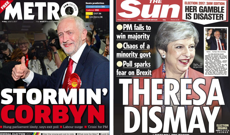Landets største avis - formiddagsbladet The Sun - spiller på forsiden på Theresa Mays navn og kalder hende »Theresa Dismay«, hvilket betyder noget i retning af 'Theresa bestyrtelse'.