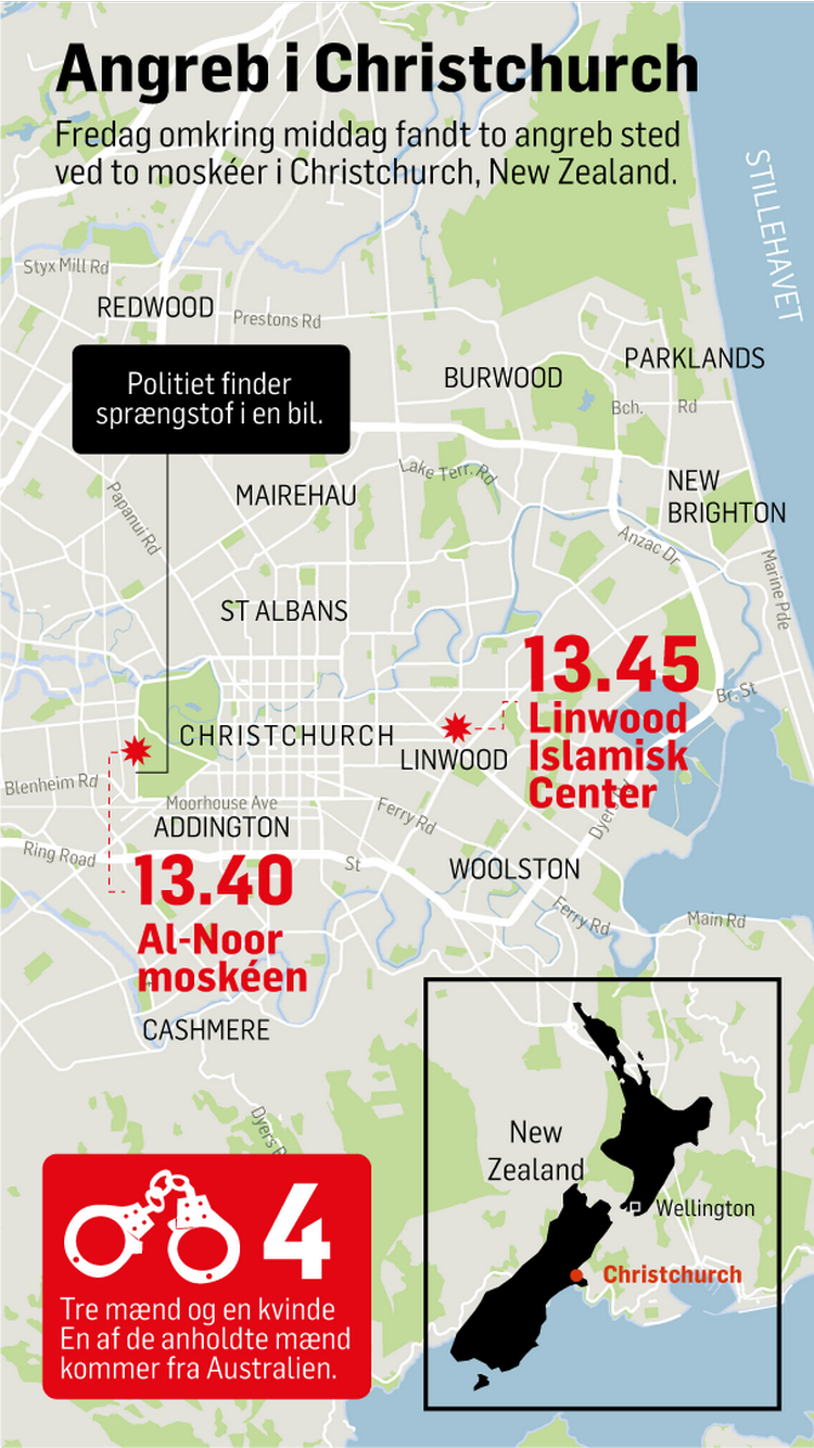 Kilder: The New Zealand Herald, Ritzau, The Guardian, The Sydney Morning Herald, nyhedssiden Stuff og New Zealand politi.