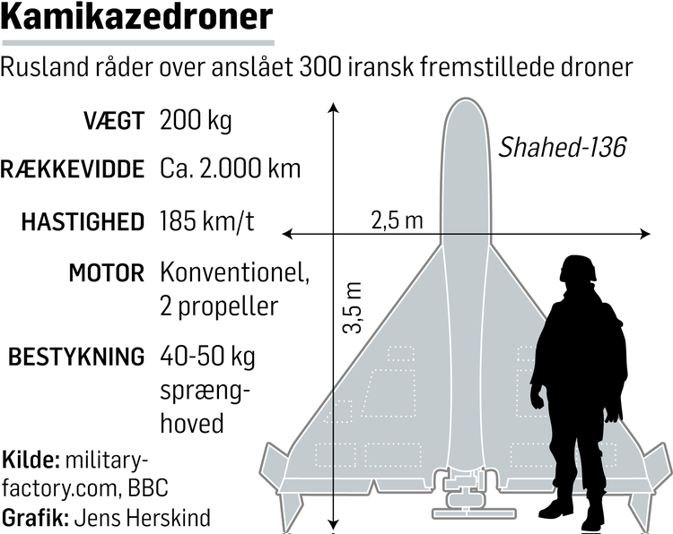 De seneste uger har Ukraine berettet om en bølge af russiske angreb med iransk-fremstillede Shahed-136-droner. Iran afviser at have leveret dronerne til Rusland.
