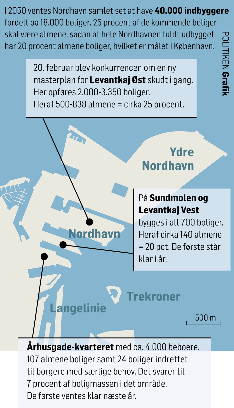 I den inderste del af den nye bydel i Århusgade-kvarteret er der kun sat plads af til 7 procent almene boliger, men i den næste etape bliver procentdelen 20, forklarer overborgmesteren og peger over mod de næste moler og fortæller med stolthed, at derovre skal bygges en 4-sporet folkeskole. Med en 11-mands fodboldbane.